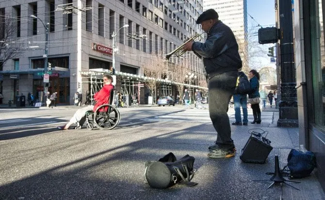 Many photographers carry around a DSLR camera and a mid-sized zoom lens. While this can be useful in many situations, it’s actually a hindrance in street photography. What makes street photographs so powerful is the fact that their subjects are often caught in an unguarded moment. Their true emotions show on their faces, and their true nature comes out. If people see you on the street with a professional camera and huge zoom lens, they may start to act guarded or unnatural.