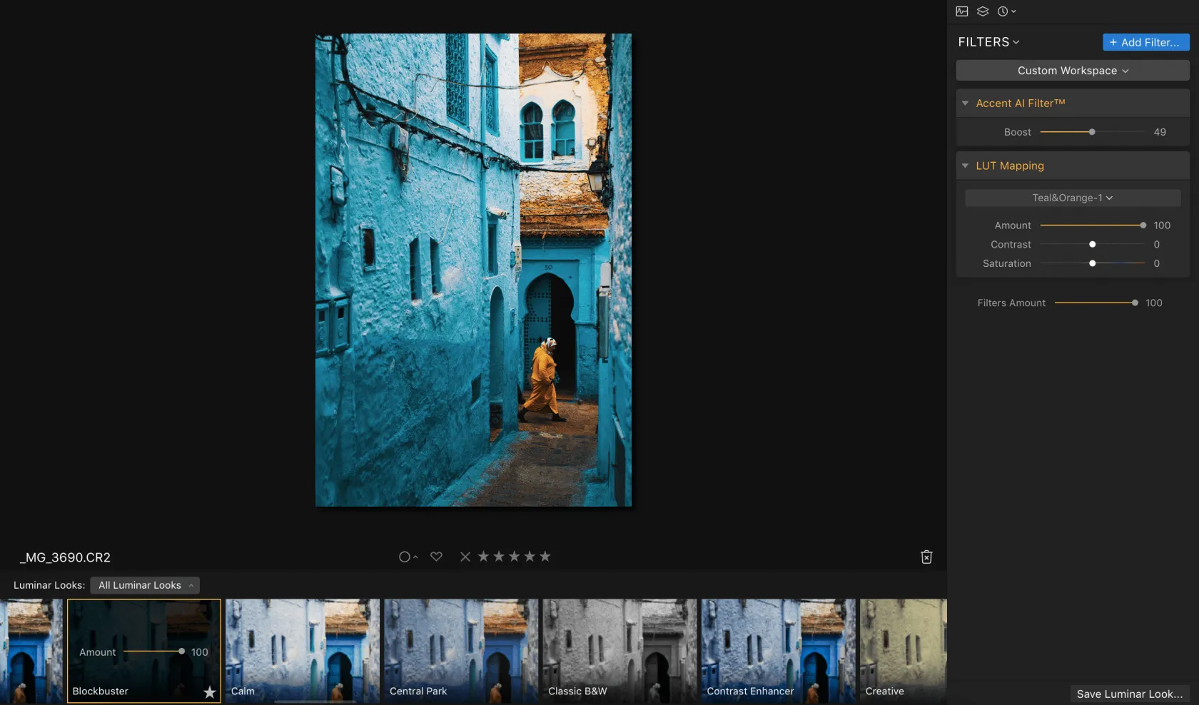 The Blockbuster preset really enhances the two main colors in the image: blue and orange. Attention is automatically drawn to the woman in orange walking through the bright blue streets, and the two complementary colors work together wonderfully.