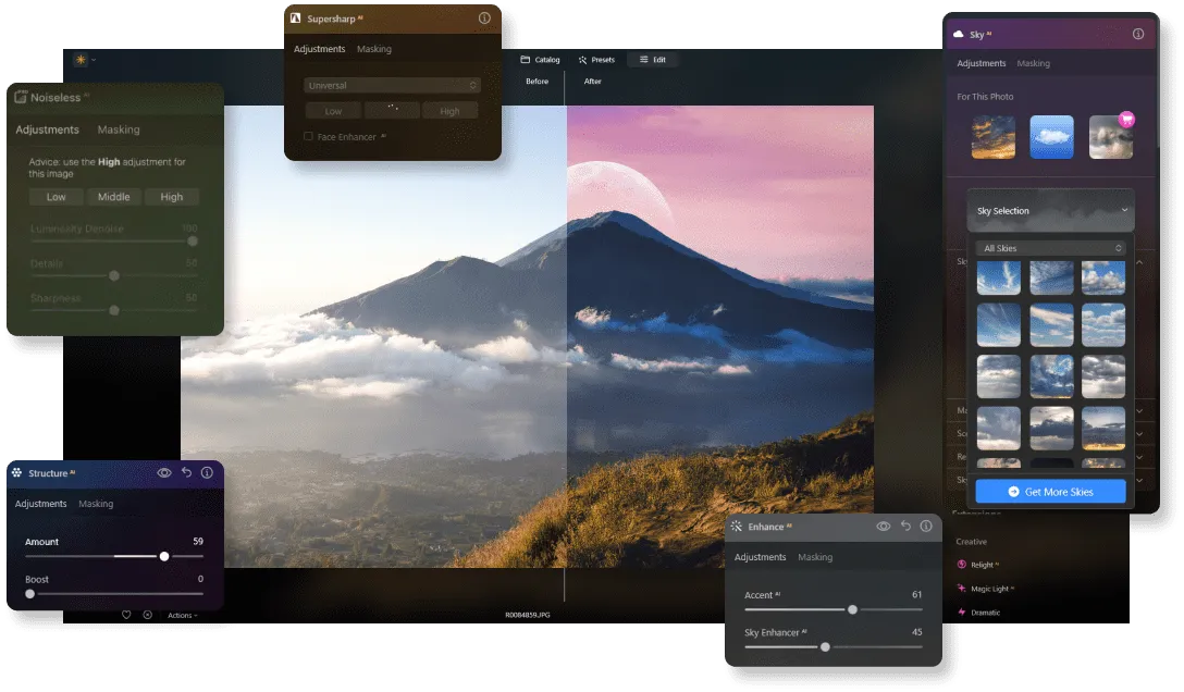 Using the latest technology, you can greatly optimize your editing workflow and achieve stunning results with minimal effort. AI-powered tools like Enhance AI, Structure AI, and Sky Replacement automatically analyze and improve different aspects of your images, easily transforming great photos into extraordinary ones.
