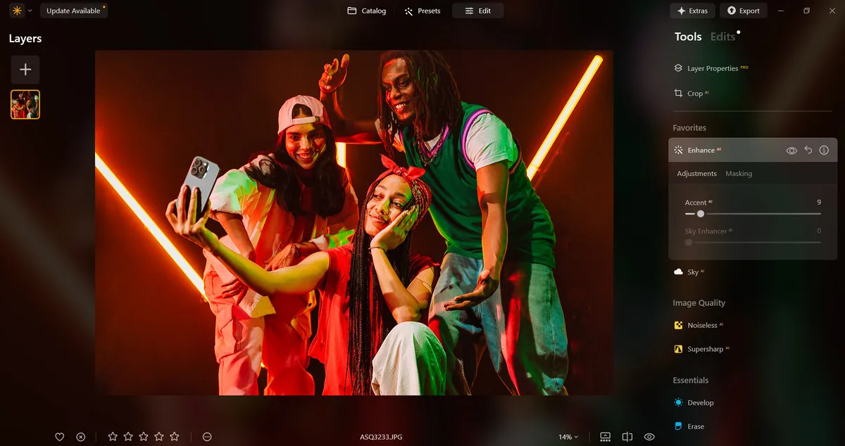 If your main goal is to improve photo clarity or resolution, Luminar Neo does the heavy lifting. It’s especially useful when you need to unpixelate image without guesswork.