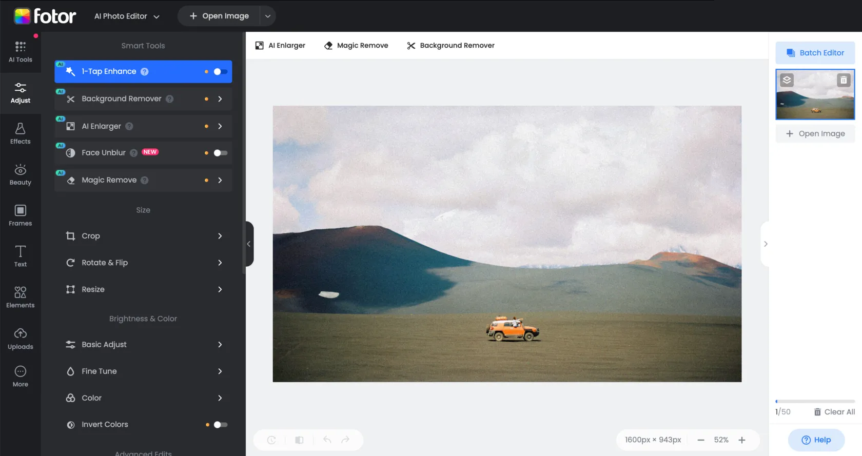 У сфері автофоторедагування головна фішка Fotor — інструмент «1-Tap Enhance». Лише один клік — і програма аналізує фото, автоматично коригуючи яскравість, контраст, насиченість та інші параметри, миттєво підвищуючи якість зображення. Також є функція «Auto Retouch», яка дозволяє легко редагувати портрети та видаляти недоліки.