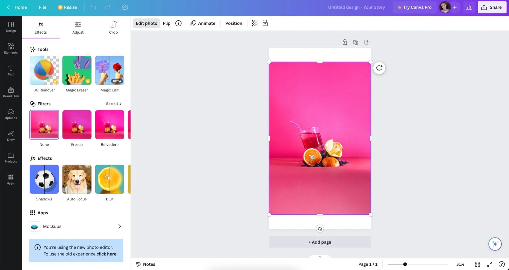 Функції редагування фото в Canva значною мірою автоматизовані, що значно спрощує процес. Інструмент «Auto Adjust» миттєво оптимізує фото, налаштовуючи яскравість, контраст і насиченість. Також доступні численні фільтри, які одним кліком змінюють настрій та стиль зображення.