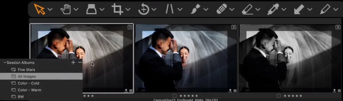 Ще одне чудове програмне забезпечення для редагування весільних фотографій, яке заслуговує на вашу увагу. Ви можете використовувати цю програму як для постобробки, так і як бібліотеку для навігації по зображеннях. Особливість Capture One полягає в тому, що програма дозволяє легко сортувати фото за сесіями зйомки, що дуже зручно, якщо потрібно швидко передати клієнту готові знімки.