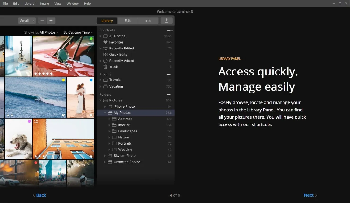 A Luminar Library creates a catalog that stores a reference to the location of folders and subfolders that contain your images on your computer. This can also include external drives and cloud-based storage. Think of a Library as a filing cabinet that holds a catalog of your images. The images are organized into folders that are labeled and sorted alphabetically to make them easy to find.