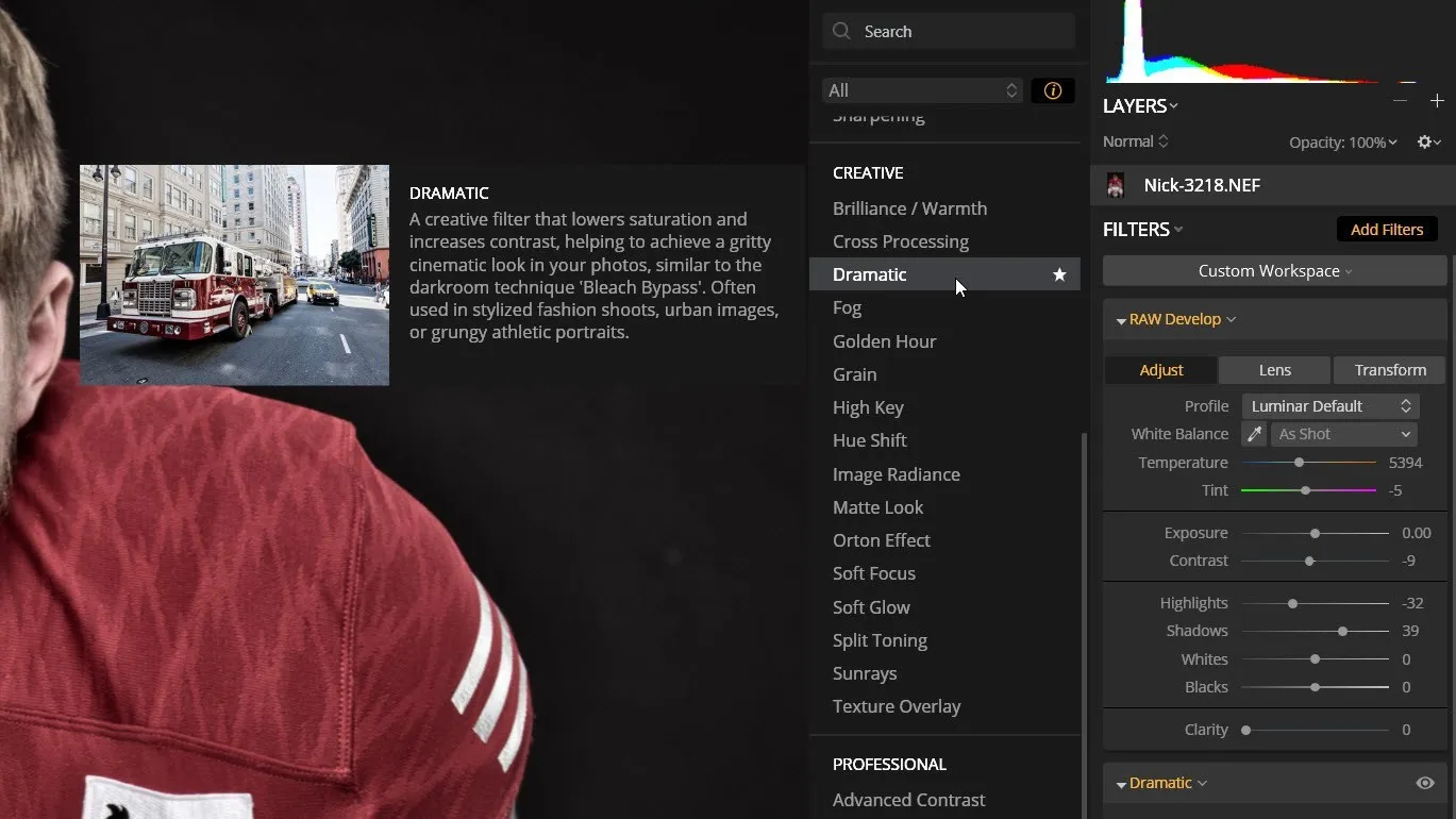 Click the Add Filter Button to access the Filters catalog. Luminar 3 has over 50 filters organized into five categories: