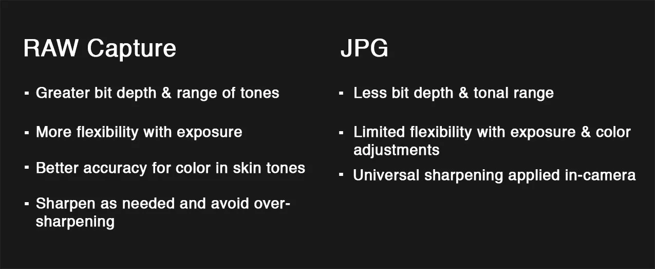 JPEG files have been compressed, or flattened, within the camera so they have a lot less editing flexibility and a much smaller bit depth. JPEG files are also sharpened in-camera and this can often result in an over-sharpened look. JPEG files can work