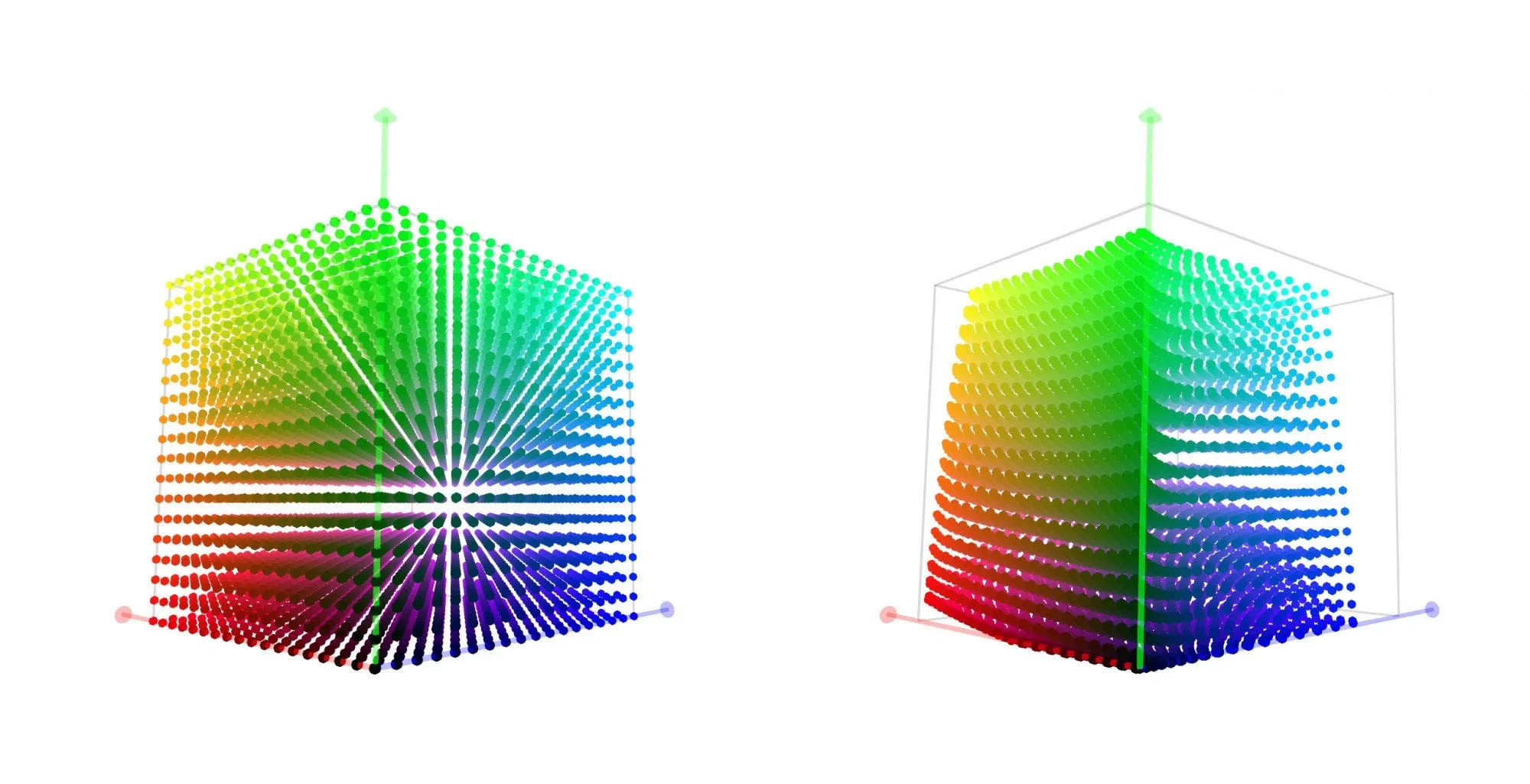 The Blue and Green channels of the image have been reduced and darkened, while the red channel has been more subtly shifted. You can also see this if we view the LUT as a cube model. The cube on the left is an unmodified image while the one on the right represent the changed RGB values.