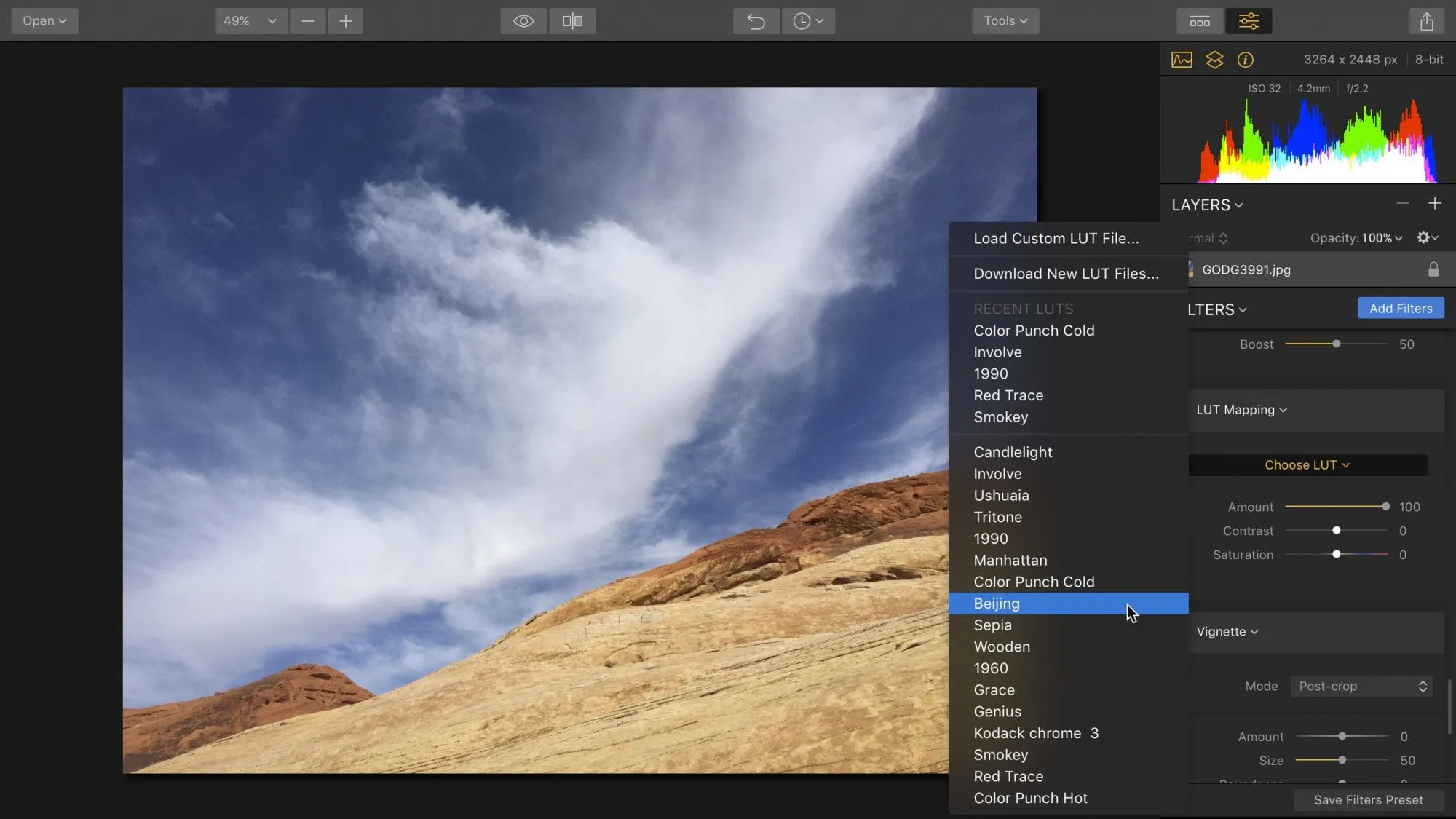 - The Choose LUT menu lets you pick from a variety of options, including built-in LUTs, recently used LUTs, or your own custom LUTs.