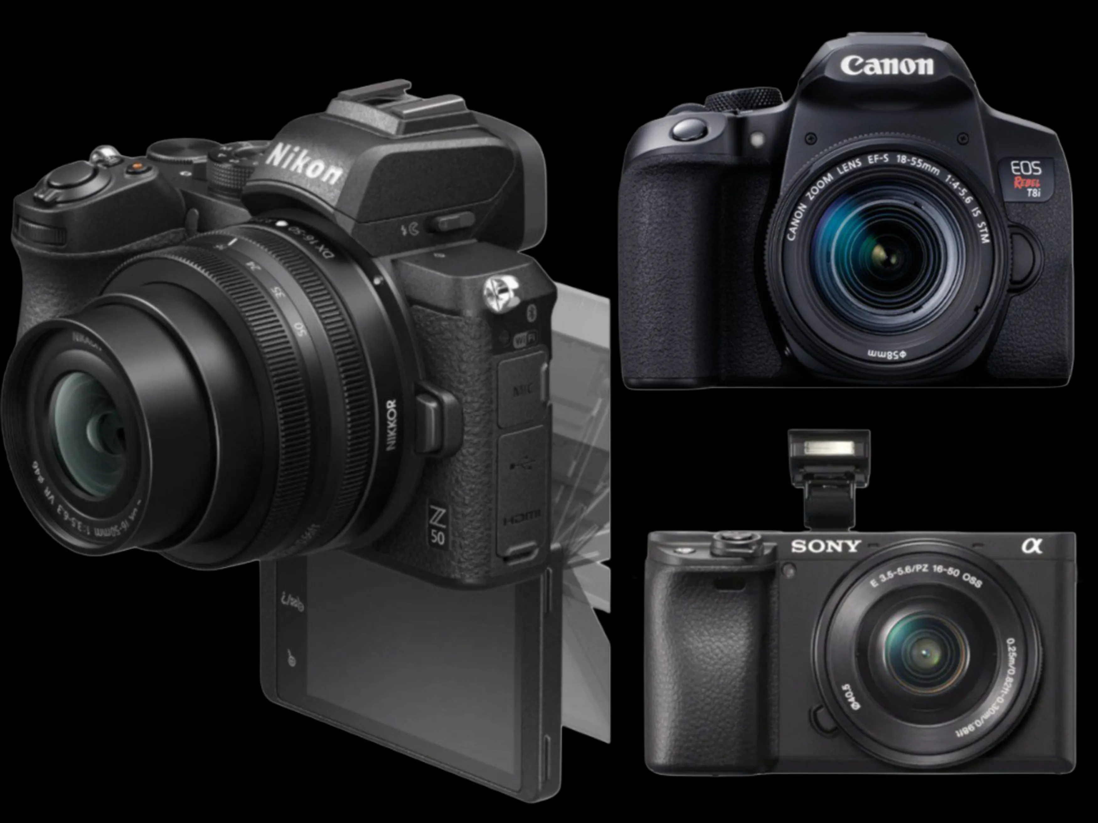 Beginner-friendly options include Canon EOS Rebel T8i (entry-level DSLR), Nikon Z50 (crop-sensor mirrorless with focus peaking), or Sony a6400 (compact, lightweight, excellent live view for macro).